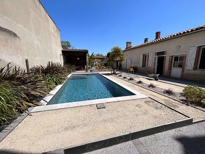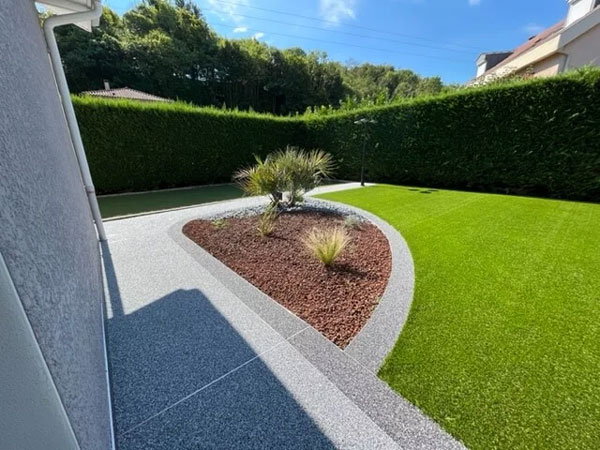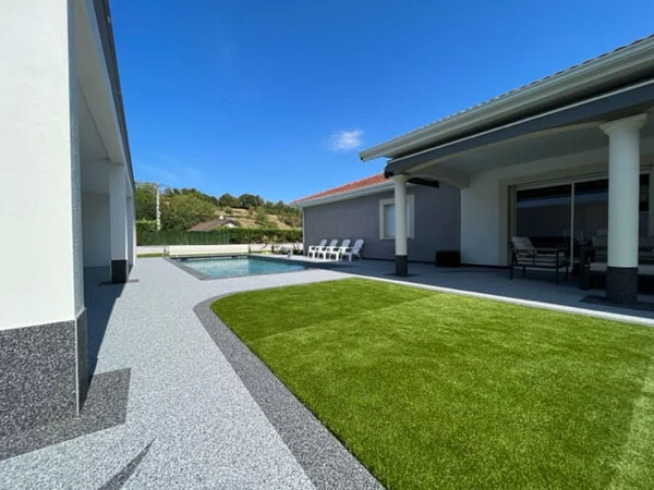 Produit : abords de piscine en Supreme 40 – Zone de jardin en Supreme 30 – Terrain de boules en Look 20.