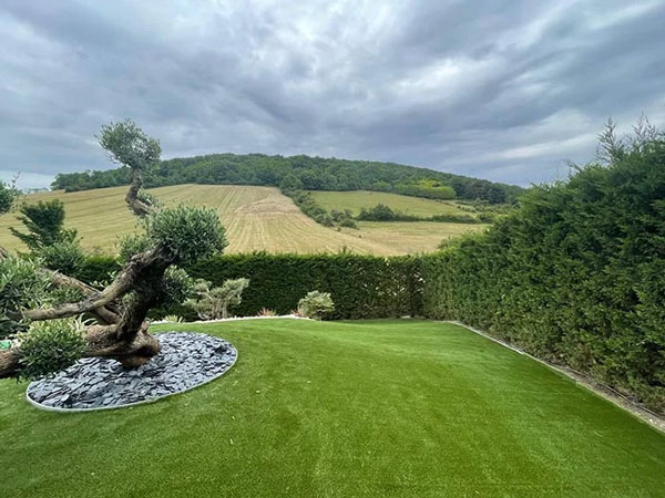 Afin de magnifier les abords de leur piscine, ils ont souhaité installé notre gazon synthétique en 30 mm. Celui-ci, bordé de plantes avec peu de besoin en eau, est en cohérence avec un climat de plus en plus chaud. Laissant tout le temps nécessaire pour profiter de la piscine !