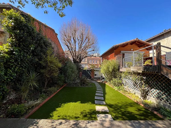 La ville rose regorge de splendides pépites. Pour une maison à l’abri des regards, ses propriétaires ont décidé d’aménager leur jardin avec du gazon synthétique. Après une installation Saccinto clé en main : préparation de sol, évacuation et installation du gazon, un chemin en pas japonais a été incrusté pour relier une terrasse tout bois à la rue. Métamorphose réussie !
