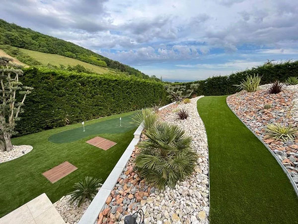 Situé sur une des plus belles communes de l’agglomération lyonnaise, ce terrain présente des reliefs propres à sa localisation : les Monts d’Or, connu pour ses forts dénivelés. Les propriétaires de ce jardin d’exception ont fait confiance à Javelot Paysage pour leur aménagement de jardin et à Saccinto pour le choix de leur gazon synthétique. Une belle surface de près de 850 m² s’est très bien intégrée à l’environnement naturel, tandis qu’une zone de putting a été installée sur un palier. Un défi de taille relevé haut la main pour un rendu haut de gamme.