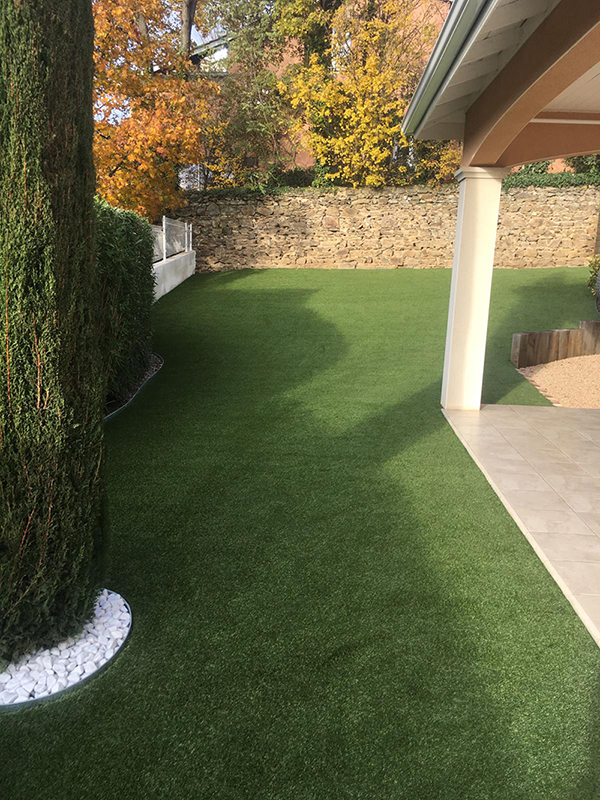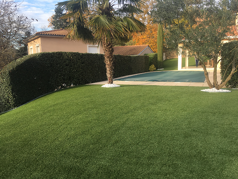 Aménagement d’un jardin clé en main en gazon Naturel 30 avec cerclages d’arbres en bordures acier galvanisées hauteur 6cm.