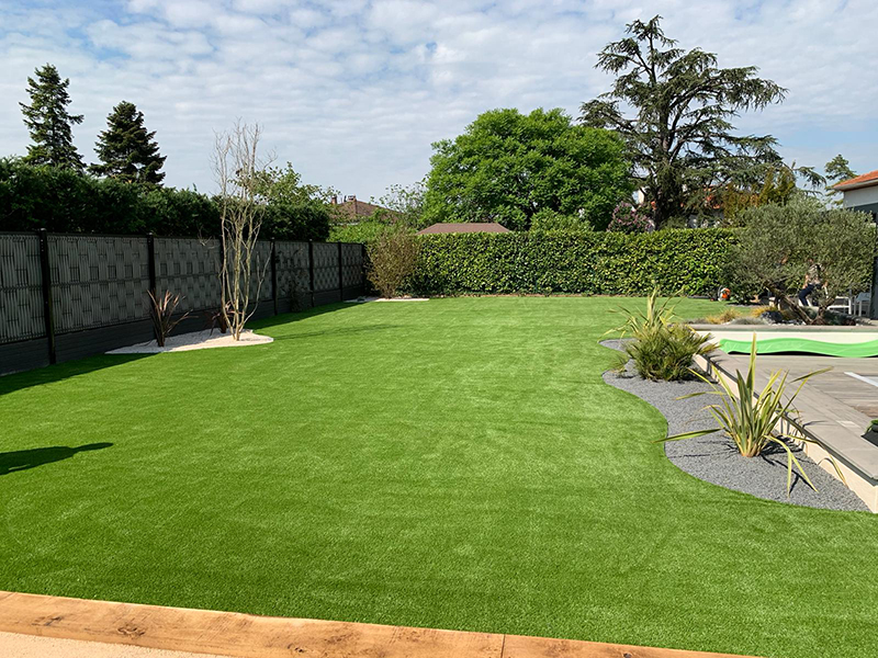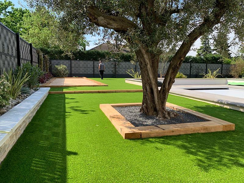 Aménagement d’un jardin clé en main en Suprême 40 avec création d’un terrain de boule en traverses de chênes. Installation de traverses de chênes et de bordures en acier galvanisées pour les contours d’arbres et massifs.